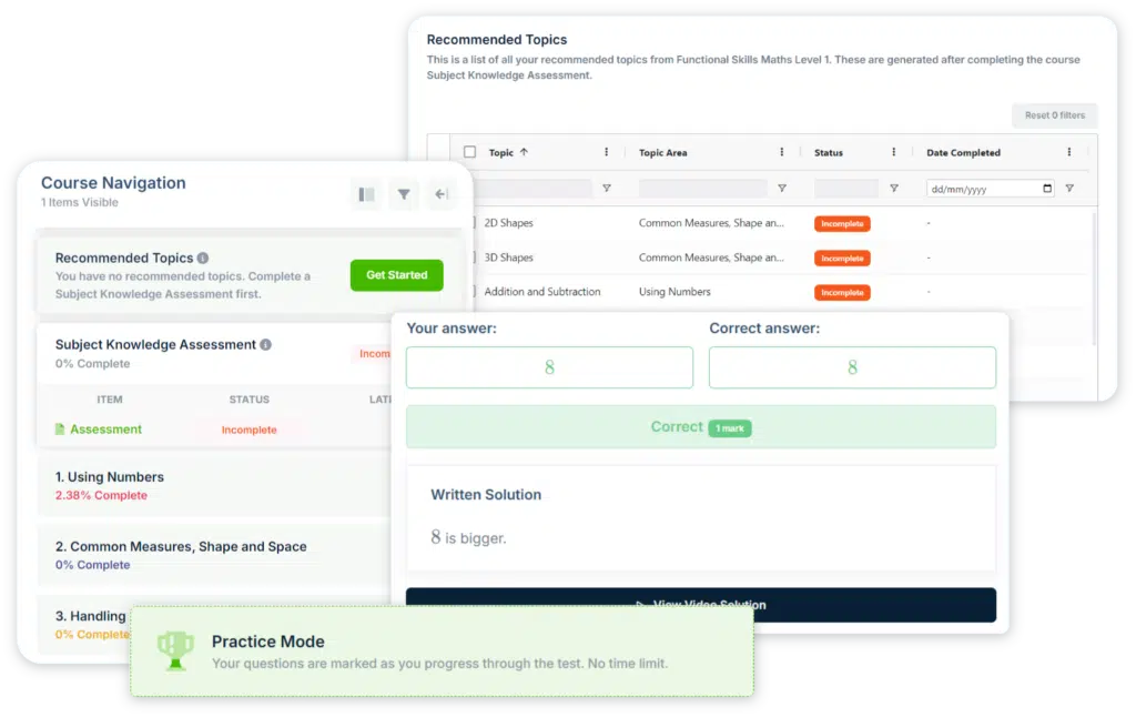 The Pass Functional Skills Entry Level software provides complete online delivery for Functional Skills Maths Entry Level and Functional Skills English Entry Level. It includes diagnostic assessments, multimedia lessons, topic tests, mock exams, AI-powered feedback, progress tracking, and ESFA-compliant reporting – all managed from a single provider dashboard.